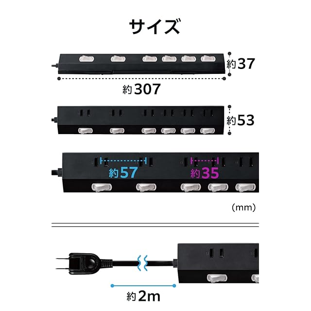 商品名:エレコム 電源タップ 雷ガード 6個口 2m マグネット 【吊下可能な回転パーツ付き】ホコリ防止シャッター付き 極性プラグ対応 スイングプラグ 個別スイッチ ブラック ECT-2820BK