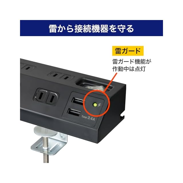商品名:エルパ(ELPA) 卓上電源タップ USB付き クランプ固定 集中スイッチ 雷ガード付き WLS-DS4232SUA(BK)