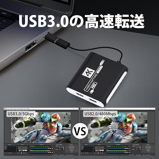 【USB 3.0高速伝送】キャプチャーボード switch対応は、USB 3.0インターフェースを採用し、最大5Gbpsの伝送速度をサポート。録画や配信中の遅延を防ぎ、クリアな画質を実現します。