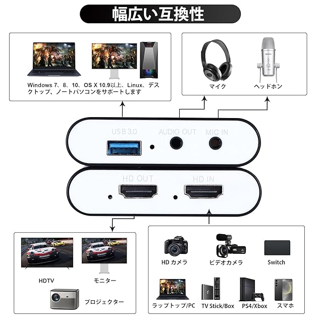 商品名:HDMI キャプチャーボード Switch対応 4K パススルー対応 1080P 60FPS USB 3.0 高速伝送 ビデオゲームキャプチャー ボード PC/PS4/PS5/Xbox/Wii U/ウェブカメラ/スマートフォン対応 Windows 7/8/10/11 Mac Linux Android iPad に対応、OBS Zoom XSplit QuickTime Potplayer 互換