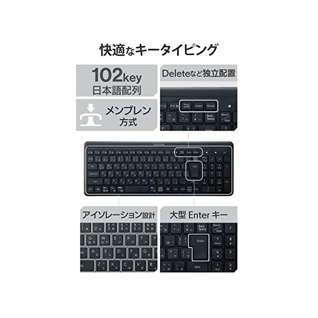 本格静音設計でありながら、軽い打ち心地を実現したワイヤレスタイプの静音薄型キーボードです。デスク周りスペースを有効に使えるコンパクトサイズで、数字入力に便利なテンキー付きです。
