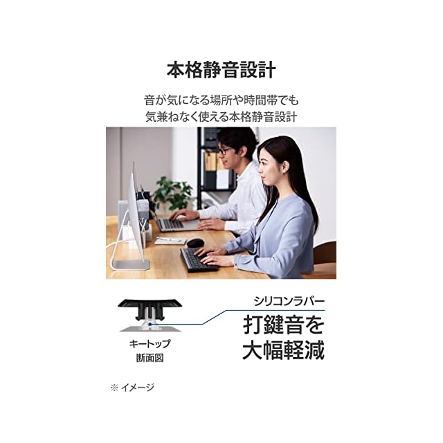 各キートップに装着したシリコンラバーによって従来品と比べて打鍵音を9割以上低減。公共施設や会議室、夜中や朝方など音が気になる場所や時間帯での使用に最適です。