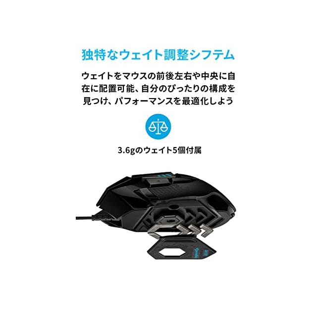 G502ならではのウエイト調整/サイドボタン/高速スクロール性能】調節可能な6 個ウェイト(4gx2、2gx4)をG502内部に様々な構成で配置し、マウスのウェイトとバランスをカスタマイズ可能。 プログラム可能な11個のボタンを装備。 軽量の超高速スクロールホイールは自由に回転して高速かつスムーズにスクロール、標準のノッチ型スクロールにも切り替え可能。