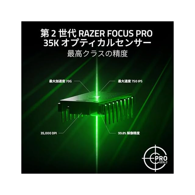 【第 2 世代 Razer Focus Pro オプティカルセンサー】 ガラスを含むさまざまな表面において、プロ級のトラッキング性能を実現。さらに、インテリジェント機能と 1-DPI ステップ調整により、照準とコントロール能力が強化されています。 Razer の新しいセンサーは、ガラスなどのさまざまな表面において完璧なトラッキングパフォーマンスを発揮。さらに、インテリジェントな機能により、照準とコントロール能力が強化されています。
