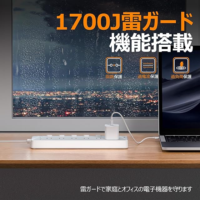 【雷ガード付き】6個電源インジケータが付いて、独立切り替え差込口は電源に接続されている時に、点灯します。なお、雷ガードLEDインジケータが付いて、サージ保護機能が正常に動作している場合に点灯して、家庭/オフィスの電子機器を雷サージの電源障害から保護できます。