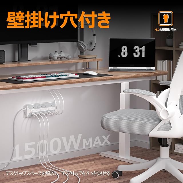 【丁寧な設計】このusb コンセント タップの底面にはゴム製のフットパッドが4つ付いているので、滑りを防ぎます。また、壁掛け用フック穴も4つ付いていて、このタコ足コンセントを、作業台、壁掛け、床置き、カウンターなどの下に安全に取り付けることができます。