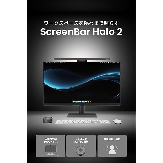 BenQ ScreenBar Halo 2は、現代のモニター使用者の目の快適性と作業効率を追求して設計された、先進的なアイケア用モニターライトです。ASYM-Light技術により、非対称光学デザインと18°のグレア防止アングルを採用。画面への映り込みを防ぎながら、デスク全体を均一に照らし、快適な作業環境を実現します。 この製品の特長である調整可能なバックライトは、モニターと周囲の明るさのバランスを整え、目への負担を軽減。長時間の作業でも集中力を維持しやすく、生産性向上にも貢献します。 Halo 2は、フォトグラファーやエンジニア、ゲーマー、学生など、視認性と集中力を求めるすべてのユーザーに最適な照明を提供。使用環境に関わらず、快適な視界をサポートします。 省スペース設計の専用クリップにより、湾曲モニターを含むさまざまなモニターにしっかり固定可能。ディスプレイを傷つけず、デスク周りをすっきり保ちます。 スマート機能としては、周囲の明るさや人の存在を検知して自動で点灯・消灯するリアルタイム自動調光機能を搭載。前回の設定を記憶することで、毎回の操作の手間も省けます。 さらに、ワイヤレスリモコンによる直感的な操作で、明るさや色温度の細やかな調整が可能。作業環境に合わせてパーソナライズされた目に優しい照明空間を構築できます。
