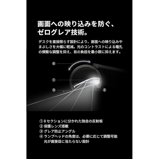【画面に光が当たらない非対称設計】独自の光学設計と反射板により、光は手元のみを照射。18°の角度設計でモニターへの映り込みや眩しさを防ぎ、目の疲れを和らげます。