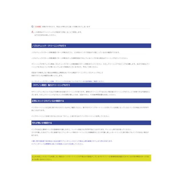 【適合プリンタ】PIXUS MG4230 / PIXUS MG4130 / PIXUS MG3630 / PIXUS MG3530 / PIXUS MG3230 / PIXUS MG3130 / PIXUS MG2130 / PIXUS TS5130 / PIXUS TS5130S 【製品サポート情報】 Q.印刷がかすれたり、色合いが明らかに違って印刷されてしまいます。 A.この症状はプリントヘッドに目詰まりが起こることで発生します。以下の方法をお試しください。 (1)ノズルチェック・クリーニングを行う ノズルチェックパターン印刷(確認パターン印刷)を行うと、どの色のインクで目詰まりが起こっているのか確認ができます。 ノズルチェックパターン印刷(確認パターン印刷)を行った結果目詰まりをしているインクがある場合はクリーニングを行ってください。 クリーニングが完了したら再度ノズルチェックパターン印刷(確認パターン印刷)を行ってください。ただしクリーニングではインクを消費します。あまり何度もクリーニングをするとインクが無くなってしまう可能性がございますので、予めご了承ください。 目詰まりが解消しない場合は6時間以上時間をおいてから再度クリーニングとノズルチェックをして改善できているか確認をお願いいたします。 (2)強力クリーニングを行う キヤノンプリンタについてはより効果のある強力クリーニングがあります。通常のクリーニングで治らない場合強力クリーニングを行うことで改善できる可能性がございます。ただしクリーニングよりもインクの消耗が激しいため、2回まで行い、その後6時間放置をお試しください。 (3)正常にセットされているか確認する インクカートリッジが正常に取り付けられているかをご確認ください。取り付けたインクカートリッジが浮いている状態になっているとインクが供給されず印字不良につながります。 インクカートリッジを取り付けるときには「カチッ」と音がするまでインクカートリッジを押してください。 (4)汚れが無いか確認する インクの出口に異物やインクの固着物が付着しますと、ヘッドへ供給されず印字不良につながります。ティッシュ等で拭き取ってください。 ゴミが付着したままプリンタに装着するとプリンタヘッド側のカートリッジとの接触部分にゴミが付着し新しいカートリッジに取り替えてもインクが出ない場合があります。 ※硬い物や突起部で拭き取ると吐出口部やプリンタヘッドのインク吸出し部を破損させてしまう恐れがあります。 ※プリンタヘッドは衝撃等に弱いため取扱いには十分注意してください。 Q.印刷がきれいに出力されません。 A.新しいインクに交換した際に、印刷がきれいにできない。色が出ない。カスレてしまう。印刷に筋が入る。白紙が出てくるなどの症状が出る場合は下記の方法をお試しください。 (1)ヘッドクリーニング プリンターにはヘッドクリーニング機能が備わっております。 液晶画面が備わっているプリンターをご使用の場合は「メンテナンス」というメニューを選択していただき「クリーニング」もしくは「強力クリーニング」を行ってください。クリーニング後、ノズルチェックパターン印刷で印刷状態を 確認してください。 これを交互に2.3回繰り返してください。 ※液晶が無いプリンターの場合はプリンターの取扱説明書、もしくはキャノンのwebサイトから取り扱い説明書をダウンロードし確認お願いいたします。 (2)インクカートリッジのICチップの清掃。 下画像の部分を柔らかい布、ティッシュ等で拭きとって再度セットしてください。 (3)インクカートリッジの吐出口の清掃 ①プリンターからインクカートリッジを取り外してください。 ②ウェットティッシュもしくはキッチンペーパー・ティッシュを水で濡らしたものをご用意ください。 ③インクカートリッジの吐出口を拭きとって下さい。下画像の方向に4・5回拭きとって下さい。 ※ティッシュにインクが全く付着しない、または段々インクの出が悪くなる場合はインクの不具合の可能性がございます。 お客様相談室にすぐご相談ください。 ④拭きとったティッシュでインクの吐出口を塞ぎ、インクを強く20回ほど振ってください。 ⑤再度吐出口を拭きってプリンターにセットしてください。 上記方法をお試しになっても改善しない場合はジットお客様相談室 0120-41-1630 土日祝日も対応(弊社指定の定休日を除く)までご連絡ください。