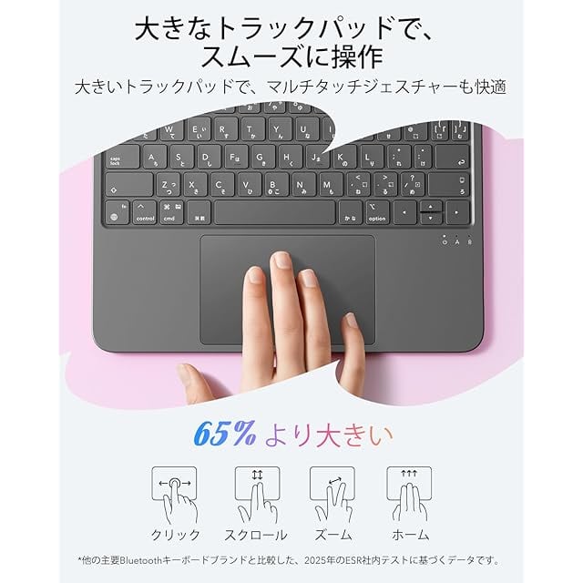 【大型高精度トラックパッド】:通常のキーボードより65%大きいタッチパッドで、操作が快適。片指ドラッグから3本指スクロールまで直感的なジェスチャーに対応。編集、ブラウジング、アプリ切替など、一連の操作がスムーズです。