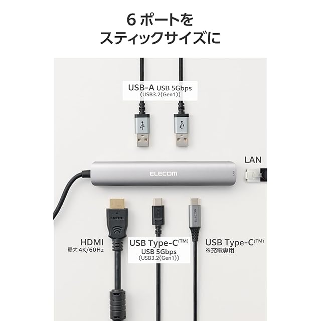 6ポートをスティックサイズに。薄型ノートパソコンの機能を拡張する、USB Type-C(TM)接続ドッキングステーションです。映像出力ができるHDMI(R)、インターネットの有線接続が可能なLANポートを備えながら、持ち運びに便利なスリムな形状を実現。USB Power Delivery対応で、パソコンに最大85Wまでスピード充電しながら周辺機器を使えます。