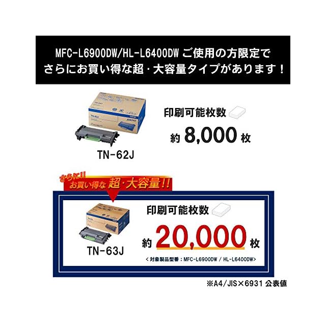商品名:【brother純正】 ブラザー工業(Brother Industries) トナーカートリッジ(大容量) TN-62J 対応型番:HL-L6400DW、HL-L5200DW、HL-L5100DN、MFC-L6900DW、MFC-L5755DW 他
