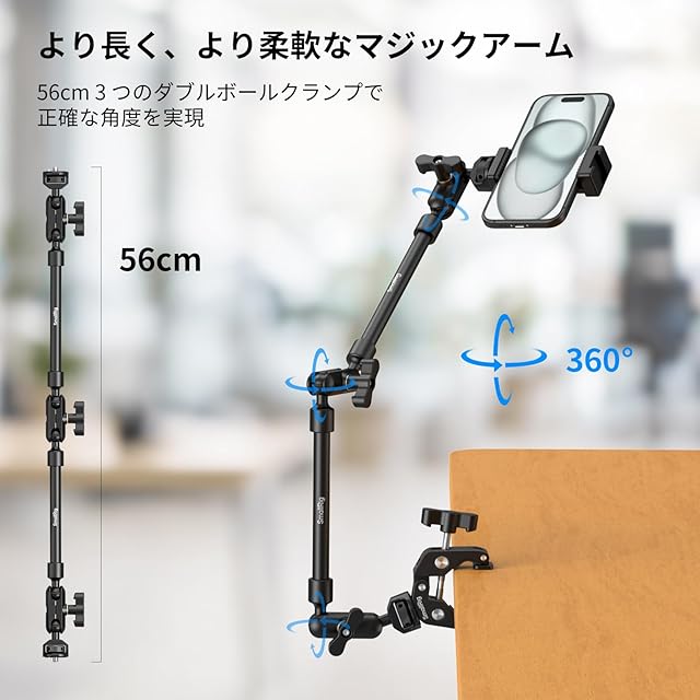 【より長く、より柔軟なマジックアーム】この 56cmのアームは、一般的なギアマジックアームよりもはるかに長いです。各ジョイントには独立した角度調整用のダブルボールクランプが備わっており、オーバーヘッド撮影、ライブストリーミング、vlog、ストップモーションビデオ、ビデオ会議に最適なアクセサリです。