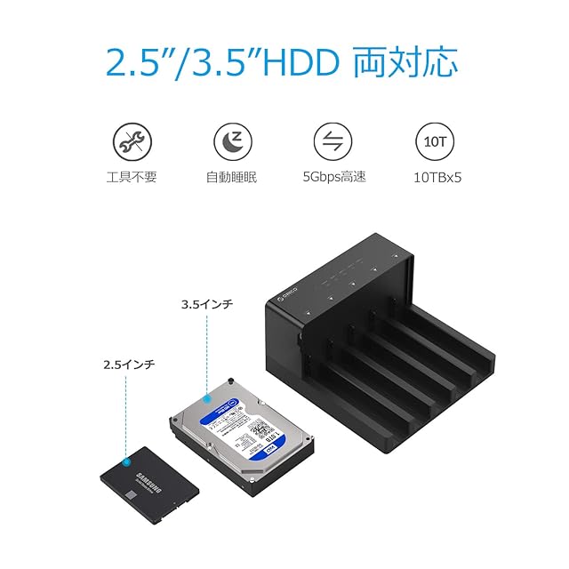 商品名:ORICO ハードディスクケース 2.5 / 3.5インチ HDD/SSD対応 16TB*5ベイ USB3.0接続 HDDコピー機能付き ドライブケース 工具不要 高放熱 電源アダプター付 ブラック 6558US3