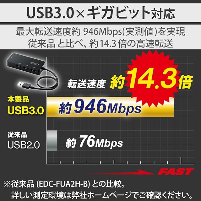 ギガビットLANアダプターを使ったギガビット通信とパソコン接続部USB3.0の組み合わせにより、USB2.0搭載の従来品(EDC-FUA2H-B)と比べ、ダウンロードしたデータを14.3倍(実測値)の速度で高速転送ができます。