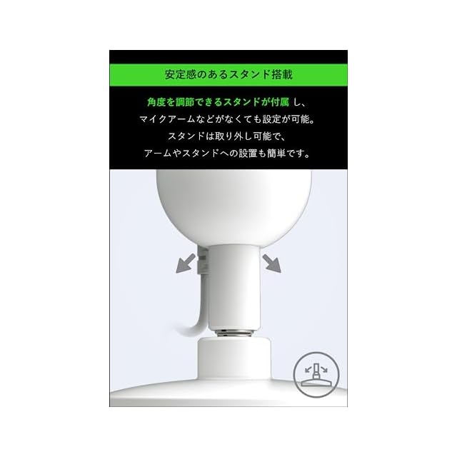 【頑丈なチルトスタンド】 頑丈なベース上に配備されたマイクは、声を拾うのに最適なスイートスポットに角度調節できます。さらにマイクを取り外して、ネジ径 5/8 インチのブームアームやマイクスタンドに取り付けることも可能です。
