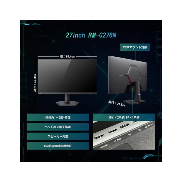 商品名:REGZA ゲーミングモニター 27インチ WQHD 240Hz モンスターハンターワイルズ推奨画質 1ms(GTG) HDR10 Fast IPSパネル Adaptive Sync HDMI対応 RM-G276N