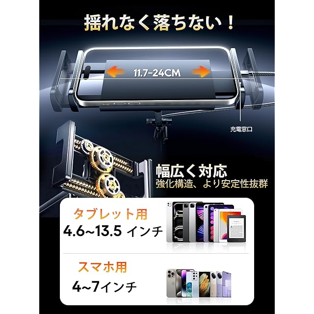 【約4~13.5インチ for iPad、タブレット、Kindleと携帯電話に適用】デバイスの対応サイズは約4~13.5インチ(117mm~240mm)なので、スマホから大型のタブレットまで、幅広いサイズの端末で利用できます。 4~13.5インチfor Kindle,N-Switch,Android Surface,Fire HD 10、Fire HD 8,iPad 第11/10/9/8/7世代、iPad Air 第7/6/5/4/3世代、iPad Pro 第7/6/5/4/3/2/1世代(2018年~2024年モデル)、iPad mini 第7/6/5/4/3/2/1世代,IPhone 16シリーズ/15シリーズ/14シリーズ/13シリーズ/12シリーズ/11シリーズ/Xシリーズ/SEシリーズ/8シリーズ,Samsung Galaxy S25/ S24/ S23/ S22シリーズ,Google Pixelシリーズ/Nexusシリーズ,Huawei,Xiaomiなどの機種を対応できます。
