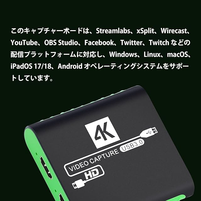 商品名:ビデオゲームキャプチャーボード HDMI 4K パススルー対応 Switch対応 PS5 対応 1080P 60FPS キャプチャー USB 3.0 Type-C 低遅延 PS4/Xbox/Wii U/PC/ウェブカメラ/スマートフォン対応 実況 会議 ライブ配信 録画 Windows 7/8/10/11 Mac Linux Android iPad OBS YouTube Twitch対応