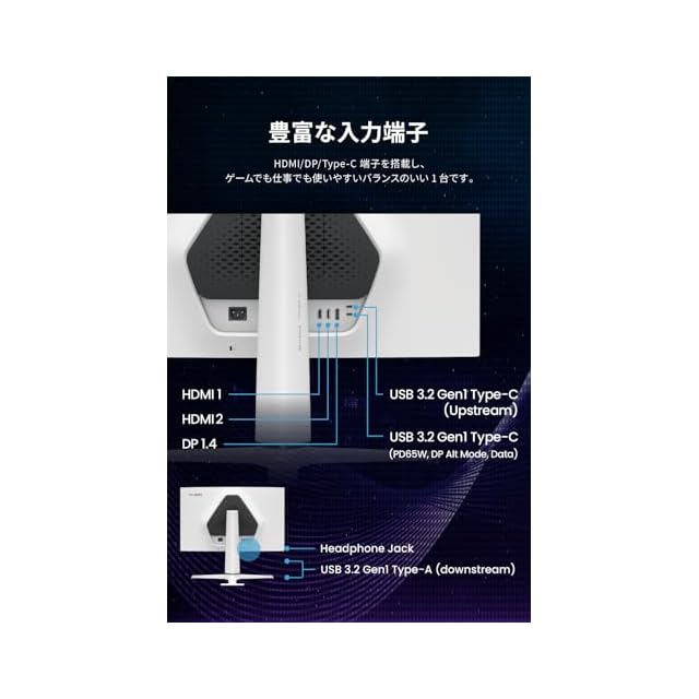 WQHD(2560×1440)解像度、4系統入力(HDMI 2.0×2、DisplayPort 1.4×1、USB Type-C(65W給電)×1)、リフレッシュレート180Hz対応モデル。優れた輝度とVESA DisplayHDR 400の高コントラスト、広色域(DCI-P3 95%のカバー)を実現し、PS5/PS4/Xboxの世界観を楽しめるゲーミングモニター