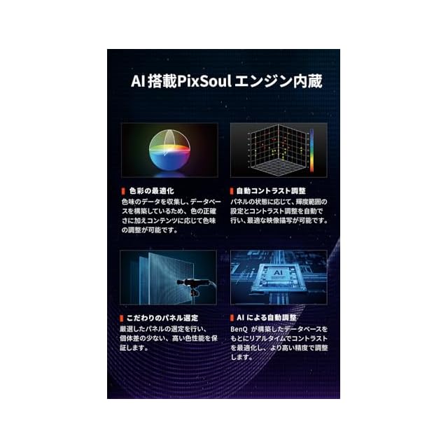 応答速度GtG 1msにより、なめらかな動画視聴やゲームプレイを実現。PixSoulエンジンを搭載、AIが独自のアルゴリズムに基づき、コンテンツや環境に合わせて色味を自動調整するShadow Phage機能