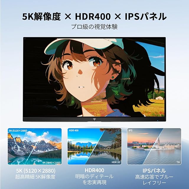 【KTC 27インチ デュアルモード 高解像度モニター】プロ仕様の画質と柔軟性を兼ね備えた次世代ディスプレイ 仕事にもゲームにも最適な、超高解像度と高リフレッシュレートを両立した27インチIPSモニター。デュアルモード切替機能で、使用シーンに応じて5120*2880@60Hzの高精細モードと2560*1440@120Hzのスムーズモードを簡単に切り替えられます。 5Kの超高解像度では、文字や画像が驚くほど精細に表示され、グラフィックデザインや精密作業にも最適。120Hzモードではゲームや動画コンテンツが滑らかに表示され、快適な視聴体験を提供します。 135%sRGBの広色域カバー率と2000:1の高コントラスト比が、鮮やかで深みのある色彩を再現。HDR400対応で明るい部分と暗い部分のディテールがくっきりと表現され、臨場感あふれる視覚体験を実現します。 接続性も充実しており、HDMI2.0、DP1.4に加え、60W給電対応のType-Cポートを装備。ノートPCと1本のケーブルで接続できるため、スッキリとした作業環境を構築できます。 ブルーライト軽減機能とフリッカーフリー技術で、長時間の使用でも目に優しい設計。Adaptive Sync対応でゲーム中の画面チラつきを抑制します。 このモニターは、クリエイターからゲーマーまで、こだわりを持つすべてのユーザーに最適な選択肢です。高画質で多機能なこのディスプレイで、あなたのデジタルライフをさらに豊かにしませんか? (特徴まとめ: ・27インチIPSパネル ・デュアル解像度モード切替対応 ・5K(5120*2880)/60Hz & 2K(2560*1440)/120Hz ・135%sRGB広色域カバー率 ・HDR400対応 ・Type-C 60W給電対応 ・Adaptive Sync採用)