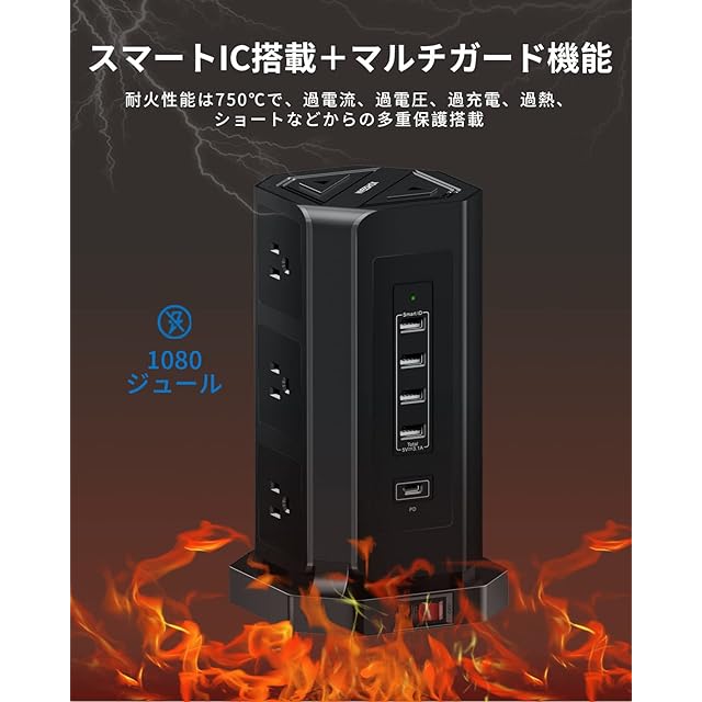 【縦型設計による省スペース】この延長コード タワーは独自の縦型タワー設計により、スペースをほとんど占有しなくて、普通の横式電源タップより70%のスペースを節約します。安全面に於いても縦形でタップに埃が溜まりにくいので安心できます。底部は広く厚く設計され、見栄えが良いと同時に安定性が増し、安定した筐体は頑丈かつ十分な積載能力を提供し、底部の6つのゴム製の脚が滑り止めになっています。それに加えて、この電源タップ usb付きは接続機器をまとめてON/OFFし、待機電力を節約可能な一括スイッチが付いています。