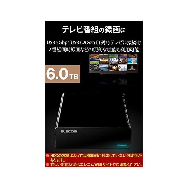 <b>【 仕様 】</b><br>■対応パソコン:USB 5Gbps(USB3.2(Gen1))またはUSB2.0ポートを搭載したパソコンおよびApple Macシリーズ<br>■対応OS(Windows):Windows 11/10<br>■対応OS(mac):macOS Ventura 13<br>■対応OS 備考:※互換性情報は弊社検証環境における動作確認時点のものです。全ての機器、OSバージョン、アプリケーション等との完全な互換性をするものではありません。<br>■外形寸法:幅183mm×奥行120mm×高さ35mm<br>■ドライブ数:1<br>■容量:6TB<br>■回転数:非固定<br>■インタフェース:USB 5Gbps(USB3.2(Gen1))<br>■入力電圧:100V、50/60Hz(ACアダプター)<br>■コネクタ形状:USB Micro-B×1<br>■セキュリティスロット:○<br>■出荷時フォーマット:NTFS<br>■冷却FAN:無し<br>■PC電源連動:○<br>■1Clickボタン:無し<br>■アクセスLED:○<br>■RoHS指令:無し<br>■付属品:USB 5Gbps(USB3.2(Gen1))ケーブル(約0.9m ※コネクター含まず)×1、ACアダプター、ラバーフット×1シート(4個)<br>■使用可能地域:日本国内 ※本製品の日本国外での使用、サポート、については、一切お受けいたしかねますので、あらかじめご了承ください。<br>■電気用品安全法:PSEマーク表示<br>■カラー:ブラック<br>■期間:1年間<br>■重量:約760g(本体のみ)<br><br><b>【 説明 】</b><br>■テレビやレコーダーなどの機器に接続し、番組の録画ができるハードディスクです。 <br>■USB 5Gbps(USB3.2(Gen1))対応で5Gbps(理論値)の高速転送が可能です。動画や写真などの大容量データを軽快に扱うことができます。 <br>■USB 5Gbps(USB3.2(Gen1))対応のテレビに接続すれば、2番組同時録画などのさらに便利な機能も利用できます。 <br>■※機能の詳細、対応可否はテレビ側の仕様に依存します。 <br>■シャープ(アクオス)、ソニー(ブラビア)、レグザ、パナソニック(ビエラ・ディーガ)、ハイセンス、LGエレクトロニクスなどのデジタルテレビに接続可能です。 <br>■※ただし、テレビがUSB-HDD録画に対応している必要があります。 <br>■ファンレス設計なので、耳障りな冷却ファンの騒音がありません。 <br>■タテ置きもヨコ置きも可能ですので、テレビも周りで最適な設置が可能です。