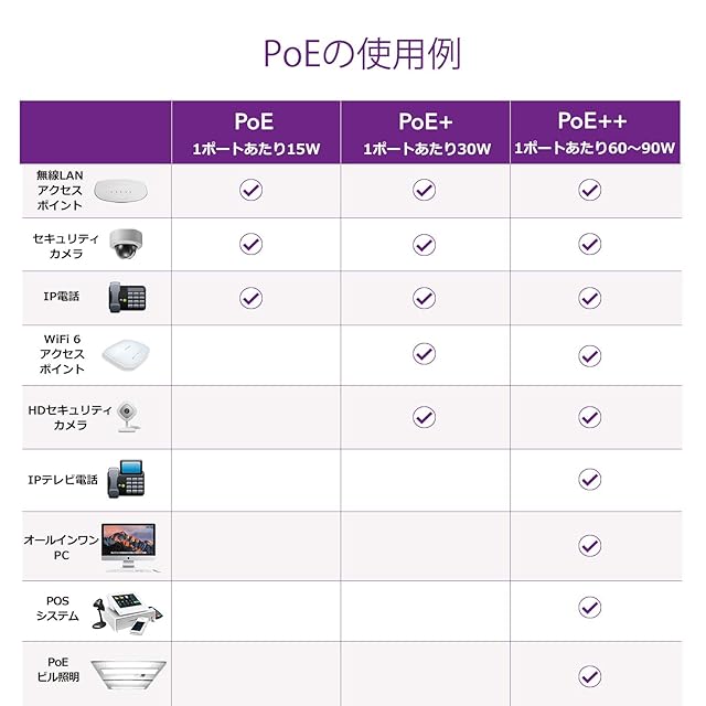 PoE+対応ポート × 15 (スイッチ全体で180Wまで給電可能)。無線LANアクセスポイントやIP監視カメラ、IP電話機に最適。