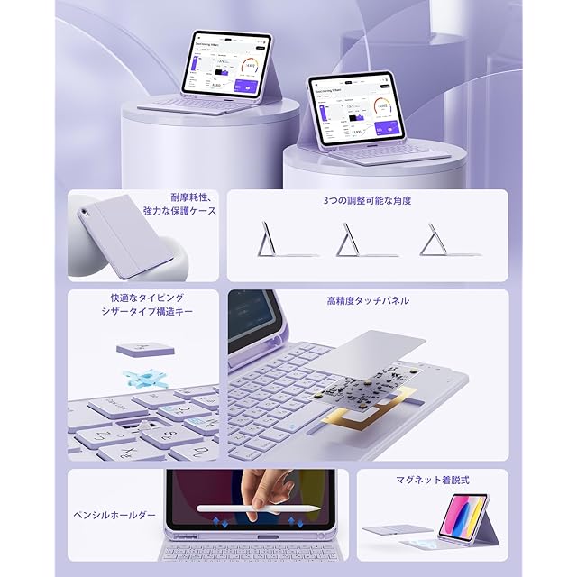 商品名:Earto for iPad A16 キーボード 11世代 2025 iPad 10世代 キーボード 10.9 タッチパッド付き JIS基準日本語配列 2台デバイスマルチペアリング ipad 11世代 ケース 脱着式 多角度調整 ペンシルホルダー付き スマート軽量 薄型ケースtype-c充電式 マグネット付き A2696/A2757/A2777対応 パープル