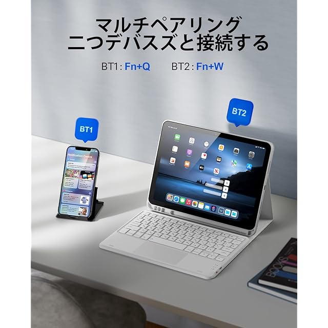 【Bluetooth5.1&マルチペアリング2台切り替え】ipad 10世代キーボードケースはBluetooth5.1機能を搭載し、10メートル以内の伝送範囲で、データ転送速度と安定性も大幅アップすることが楽しめます。二つBluetoothチャネルがあるので、1台マルチペアリングキーボードでiPadやiPhone、ボタンを押すだけで自由に切り替えることができます。(Bluetooth接続のみをサポートします。)