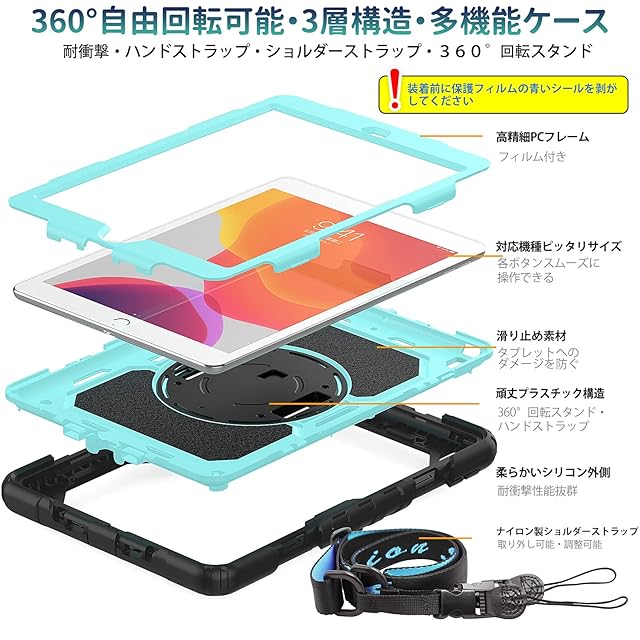 商品名:SEYMAC stock iPad 10.2インチ 第9世代/第8世代/第7世代 ケース 耐衝撃 保護フィルム付き ペン収納 360°回転スタンド ハンドストラップ ショルダーストラップ 全面保護カバー (スカイブルー+ブラック)