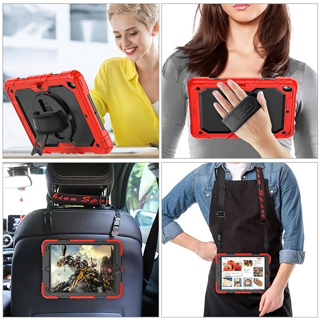 SEYMAC stock iPad 10.2インチ 第9世代/第8世代/第7世代 ケース 耐衝撃 保護フィルム付き ペン収納 360°回転スタンド ハンドストラップ ショルダーストラップ 全面保護カバー (レッド+ブラック)