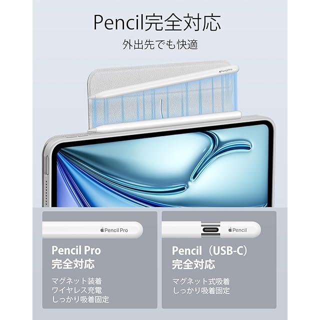 【Pencil Pro&Pencil (USB-C)対応】:Pencil Proへ完全対応かつ、磁気充電用の側面の溝と、Pencilをしっかりと固定するマグネットクラスプを備えています
