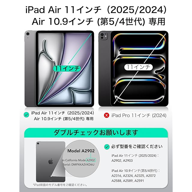 【互換性】:iPad Air 11インチ(2025/2024)、iPad Air 第5/4世代(2022/2020)専用です。モデル:A2902、A2903、A2316、A2324、A2325、A2072、A2588、A2589、A2591,他のiPadモデルと互換性がありません