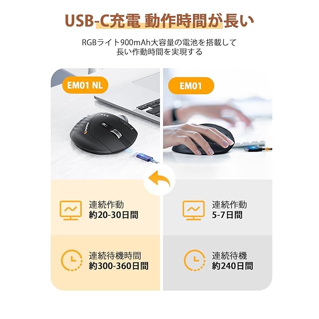 充電式エコ的 電池不要の充電式なため、エコで環境にやさしい充電式トラックボールマウスです。市販の電池式や、低電量の物より、耐久性のある900Mah大容量の電池を搭載しており、付属の充電ケーブルで、フル充電したら、連続待機時間は約300-360日間、約160-240時間(約20-30日間)使用可能です。ProtoArc EM01の5-7日の作業時間よりも倍長くなります。充電回数も少なく、無線で一番ストレスとなる乾電池の交換という作業は不要です。【注意❶.1日8時間PCを使用中に、マウス操作を25%程度行うこととして、計算した使用時間です。➋.充電用のusb-cコネクタ部分が少々狭くて、必ず付属されたケーブルで充電してください。】