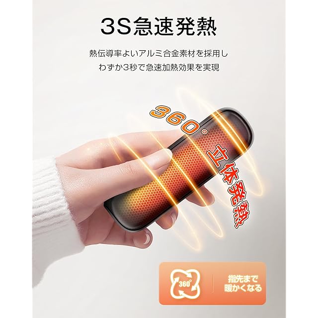 【3秒急速発熱で即座に暖かさを実感】YUSIDO充電式カイロは、優れた熱伝導性を持つアルミニウム合金を採用し、たった3秒で急速に発熱します。手元に持つだけで、瞬時に指先から手のひら全体が暖かさに包まれるため、寒い日でも待つことなく快適に過ごせます。また、360度全方位から均等に暖かさを提供し、手全体がバランス良く温まるため、冬の厳しい寒さの中でも確実に体を守ってくれます。寒冷地での通勤やアウトドア、スポーツ観戦など、寒さが気になるあらゆるシーンで役立つ優れたアイテムです。