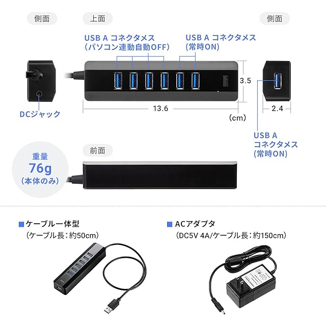 商品名:サンワダイレクト USB3.0 ハブ 電源付き セルフパワー/バスパワー両対応 7ポート PC連動自動オフ機能 USB3.1 小型 ACアダプター付き USB 拡張 増設 ブラック 400-HUBA070BK2