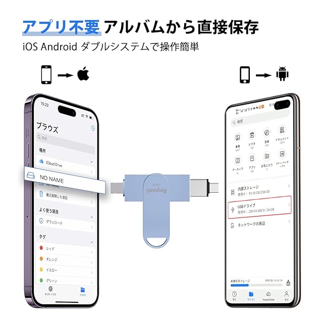 【4in1 多機種対応・専用アプリ必要なし、安心安全usbメモリ】当社のusbメモリは専用アプリ必要なくて、Ap社の「ファイル」を使用して、phone データ直接保存可能です。他社の専用アプリ必要usbメモリに比べて、アプリのダウンロードの邪魔がなくて、phone・iPadのデータが直接バックアップ可能、もっと便利、安心安全!さらに、IOS・USB-A・USB-C端子が4 IN 1で、幅広いデバイスを対応可能で、データ転送、phone・iPad容量不足、簡単に解消出来ます。