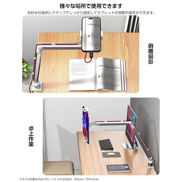 本製品は7つの関節があり、可動域が広いです。または4.7-17.3インチのほとんどのスマートフォン、タブレット、モバイルモニターに対応できるアームスタンドです。