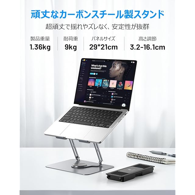 【頑丈なカーボンスチールスタンド】本体は、耐久性と安定性に優れたカーボンスチールで作られています。揺れやズレがなく非常に頑丈で、最大9kgを支えることができます。ゲームやノートパソコンでの作業に適しています。