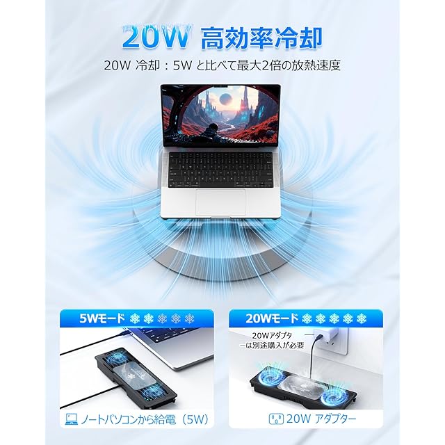 【2段階冷却と20dBの超静音】冷却機能は2段階です。低モード(5W)は20dB以下と超静音で、ノートパソコンでの作業やインターネット閲覧などに最適です。高モード(20W)はより効率的な冷却効果を発揮し、ゲームや高負荷ソフトウェアを実行している場合に最適です。(ご注意:20Wで冷却を使用するには、本体を20Wのアダプターに接続してください)