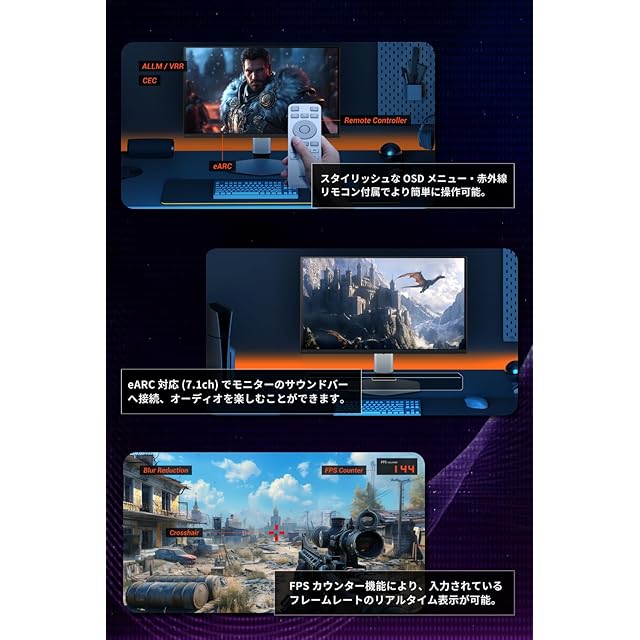 専用リモコンで簡単操作、FreeSync Premium Pro対応、HDMI 2.1/DP 1.4接続、eARC対応。ゲームも映画も快適で美しく、ハイレベルな映像体験を楽しめます。