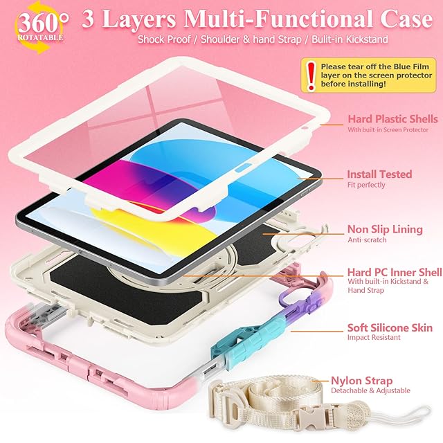 Product Descriptions</b><br><br><b>Features</b><br>1.Built-in kickstand will makes you using your case for ipad 11th 10th Generation easily, when you are watching video or playing games.<br>2.360 degrees rotating/Shoulder Strap are more convenient for you to carry your case for ipad 11th 10th Generation 2025 2022 / 11th gen/ 10th gen case for ipad 11/10.9 inch. <br>3.Colourful design can make your case for ipad 11th/10th Generation looks fashionable.<br><b>Shock prevention</b><br>Keeps case for ipad 11th/10th Generation away from Shock, prolonging the lifetime of case for ipad 11 / case for iPad 10.<br> <b>Dust prevention</b><br>Port plugs of the case protect dust from entering into case for ipad 11th/10th Generation's screen, making case for ipad stay clean and debris free.<br><b>Anti-scratch function</b><br>Guard against fingernails or other sharp objects scratching 11th 10th Gen case for ipad for maintaining case for ipad 11th 10th Generation's complete appearance.<br><br><b>Package Contents</b><br><br><b>1 x case for ipad 11th 10th Generation 11/10.9 inch 2025/2022</b> >>> 3 pieces combination installation, heavy duty full-body case for ipad 11/10, with portable shoulder strap, built-in kickstand, PC & silicone material.<br><b>1 x Portable Shoulder Straps</b> >>>The shoulder strap is easy to attach and remove, it can use together or <br>separate with your case for ipad 11th 10th Generation. With the strap can make your case for ipad using easily when you go to school, to work and on vacation without the need for a purse, bag or backpack. It can hang from anywhere for your better entertainment.<br> <b>1 x Clean Cloth</b> >>> Lint free, soft, reusable, easy to wash and quick drying.<br> <b>1 x User manual front card</b> >>> Our user manual front card can help you install it easily & clearly.<br><br><b></b><br>SEYMAC stock Team is a professional high-quality team servicing for customers when you're purchasing SEYMAC stock case for ipad 11th 10th generation.<br>