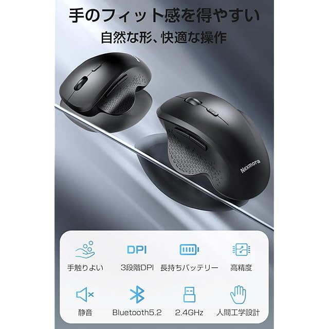 商品名:マウス Bluetooth 無線 【人間工学設計|5ボタン|2WAY接続】 ワイヤレスマウス 戻る 進む ボタン搭載 軽量 静音 type-c 充電式 3段階DPI切替 800/1200/1600 USB ワイヤレス ブルートゥース テレワーク ゲーミング 持ち運び ノートパソコン パソコン iPad pc Windows macbook Mac対応 レシーバー付き