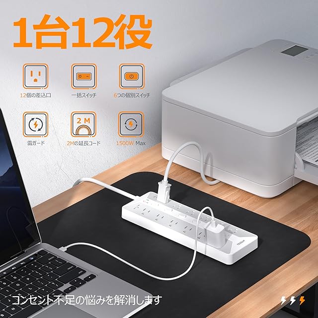 電源タップ スイッチ付き 延長コード 2m コンセント TESSAN 12個AC口 テーブルタップ 壁掛け マルチ oa 幅広コンセント 蛸足コンセント タコ足配線 省エネ 雷ガード 2ピン 3ピンプラグ対応