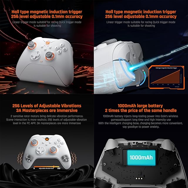 【ホール効果トリガー】ホール効果コントローラーの高精度トリガーはあらゆるゲームに最適で、レーシングゲームにはリニアトリガー、FPSにはヘアトリガー(ソフトウェア)が最適です。 【FPS Eスポーツコントローラー構成】有線の場合は1000 Hzのeスポーツレベルのリターンレート、無線の場合は125 Hzのリターンレート。【12ビットADCと2000レベルの軸解像度】よりスムーズなエイムは、より高い軸解像度によってもたらされます。 【0デッドゾーン】FPSアルゴリズム2.0の正確な照準奇跡の動き。【1000mAhバッテリー】1000mAh バッテリーは GALE ワイヤレス コントローラーに長時間電力を供給し、最大 10 時間の激しい使用に耐えます。