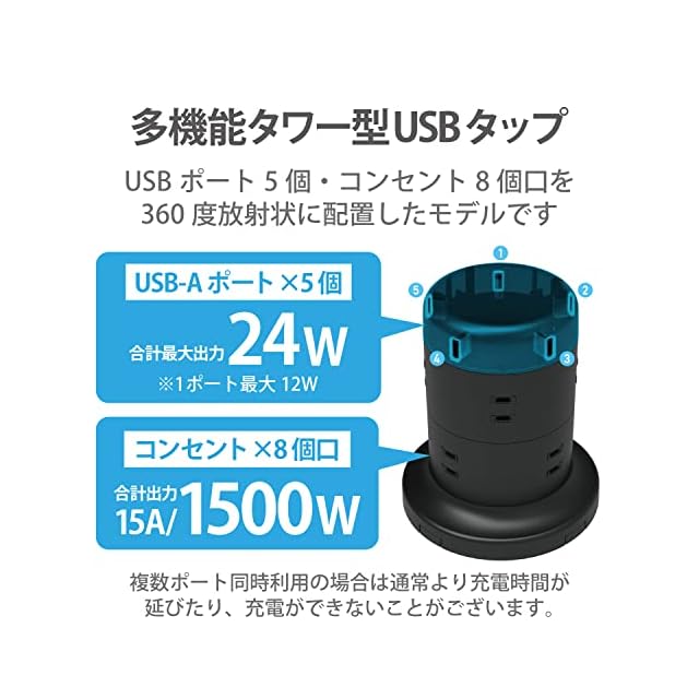 差込口8口とUSBポート5口が一体となったタワー形状のUSBタップです。