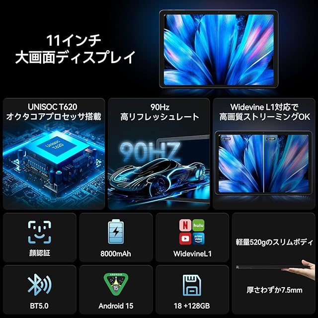 商品名:2025新登場 FPD タブレット 11インチ FHD+ Android 15 90Hz、1920x1200 IPS UNISOC T620 8コアCPU 18GB RAM+128GB+1TB拡張、8000mAh 大容量バッテリー 、Type-C 18W 急速充電 2.4G&5G Wi-Fi BT5.0 デュアルカメラ5MP+13MP+顔認識 GPS OTG Widevine L1対応