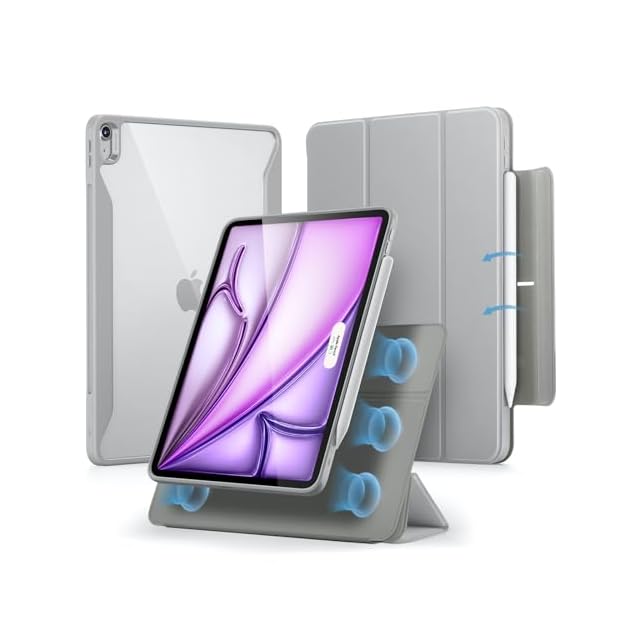 ESR iPad Air 13インチ ケース (2025/2024、M3/M2) 専用 Pencilホルダー付き 取り外し可能マグネットカバー 縦置き/横置きスタンド Pencil Pro/USB-C完全対応 Rebound 360シリーズ グレー